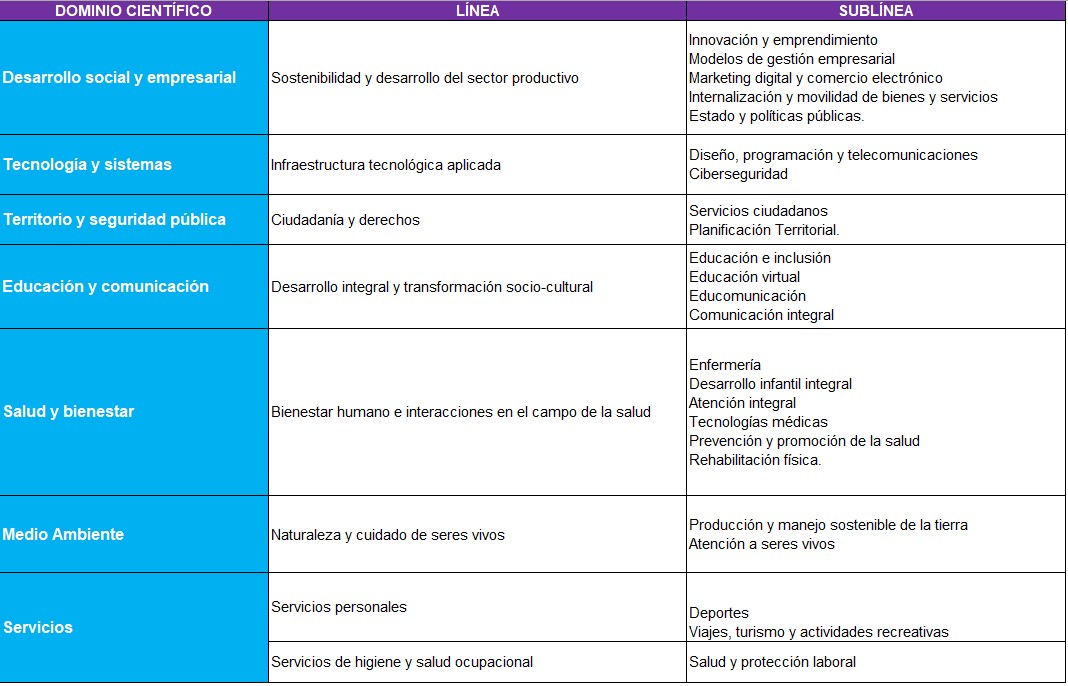 El Tecnológico Universitario Argos cuenta con los siguientes dominios y líneas de investigación; los dominios se encuentran articulados con la Agenda 2030 y con el Plan Creando Oportunidades 2021 – 2025; las líneas de investigación son enfoques que abarcan conocimientos, inquietudes y perspectivas de análisis que coadyuvan al desarrollo de proyectos construidos de forma sistemática en torno a un tema de estudio.